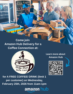 Come join Amazon Hub Delivery for a Coffee Connection at Bridge Street Brew-Tique. Enjoy a free coffee/drink and learn more about the Amazon Hub Delivery program.